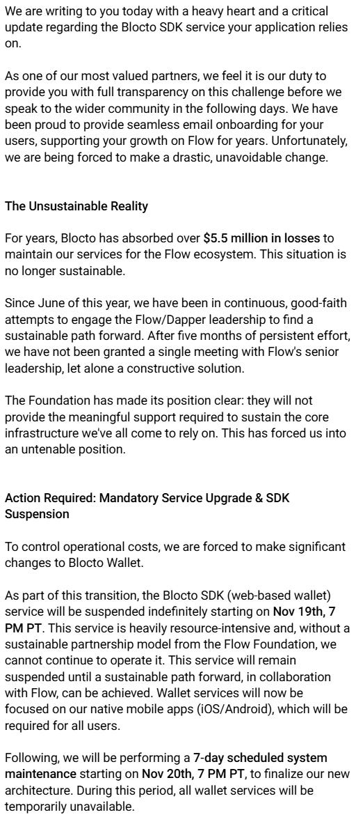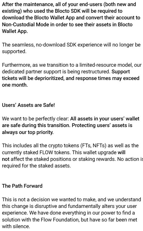 The message that the Blocto team shared with us is included in the attached two screenshots. We have shared the message in its original form for transparency. We do not have insight into discussions between Blocto and Flow.